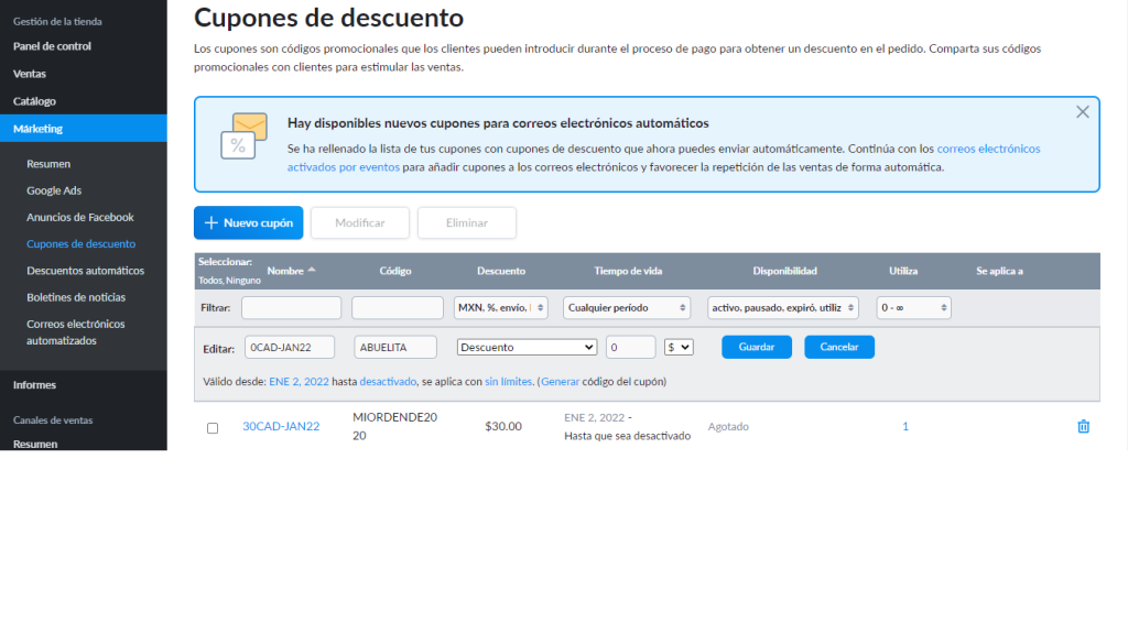 1. Desde tu Panel Control, ve a Marketing → Cupones de descuento.