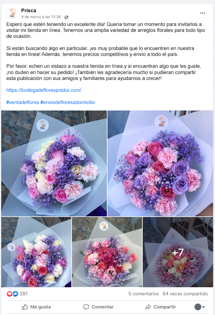Así se tendría que ver tu publicación en tu perfil. No olvides añadir hashtags que estén relacionados al giro de tu negocio. Según el algoritmo de Facebook con dos está bien. En este caso nosotros decidimos colocar #ventadeflores #enviodefloresadomicilio